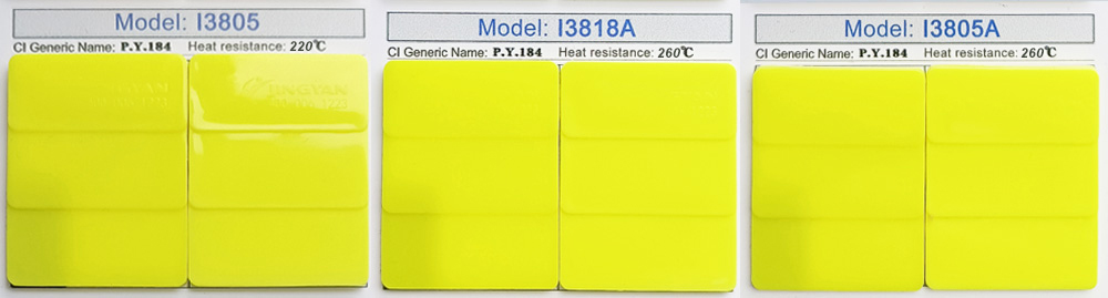 | 釩酸鉍黃I3805A | P.Y.184 | 260 | 8 | 5 | 5 | 綠相+1 | 遮蓋、通用 |