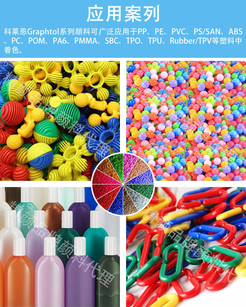 科萊恩Graphtol系列顏料可廣泛應(yīng)用于PP、PE、PVC、PS/SAN、ABS、PC、POM、PA6、PMMA、SBC、TPO、TPU、Rubber/TPV等塑料中著色。