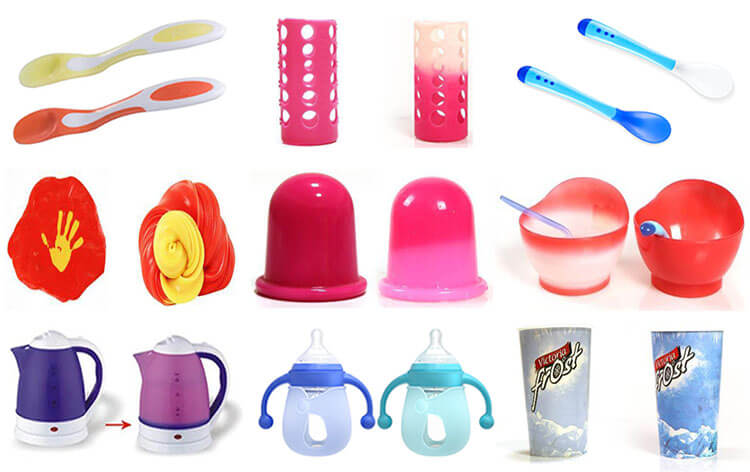 感溫變色顏料的顏色種類很多,變色的溫度范圍也可以調(diào)控,不同系列的感溫顏料之間可以互相配色和拼色,因此可以獲得更加豐富多彩的顏色,從而制造出各種顏色和在不同溫度下變色的絢麗產(chǎn)品。