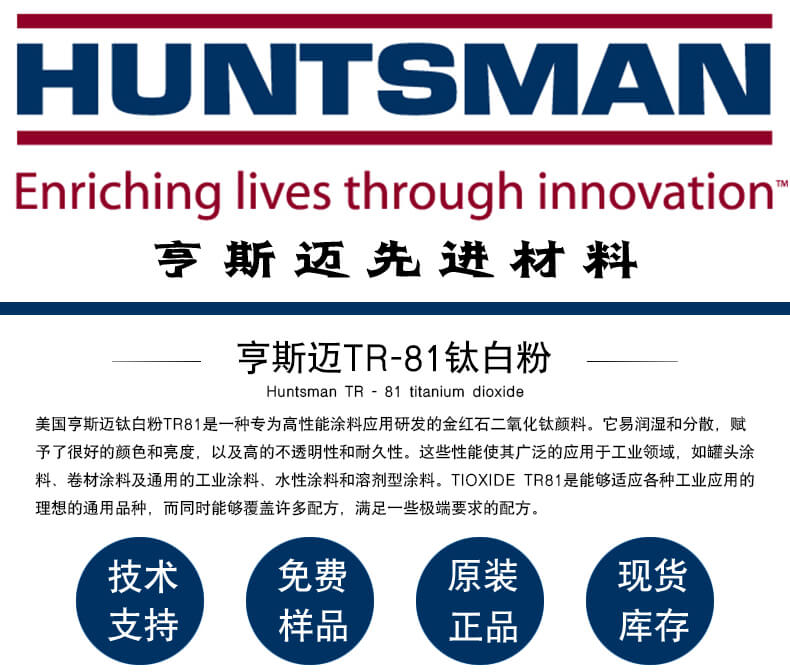 | 產(chǎn)品型號:TIOXIDE TR81 | 產(chǎn)品規(guī)格:25KG/包 | 產(chǎn)品用途:涂料專用 | 加工工藝:氯化法 |