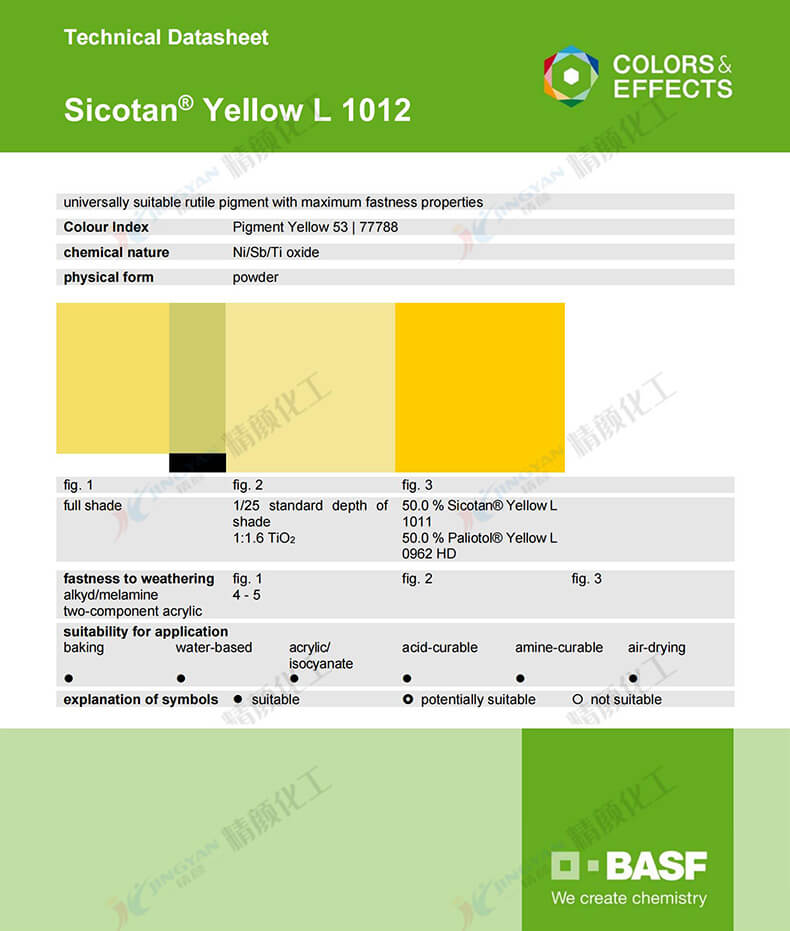 德國巴斯夫BASF Sicotan Yellow L1012鈦鎳黃顏料是一種高不透明的綠相黃色高性能無機(jī)復(fù)合顏料,金紅石型鎳/銻/鈦氧化物復(fù)合無機(jī)顏料,具有優(yōu)異的熱穩(wěn)定性、高耐候性以及高遮蓋力,推薦與綠相黃色的有機(jī)顏料結(jié)合使用,可以經(jīng)濟(jì)的成本替代鉻酸鉛顏料,巴斯夫色麗泰L1012鈦鎳黃無機(jī)顏料主要應(yīng)用于涂料行業(yè)的著色應(yīng)用,適用的涂料應(yīng)用體系包括水性體系、烘烤體系、丙烯酸酯/異氰酸酯體系、酸固化/胺固化體系和空氣干燥體系等。